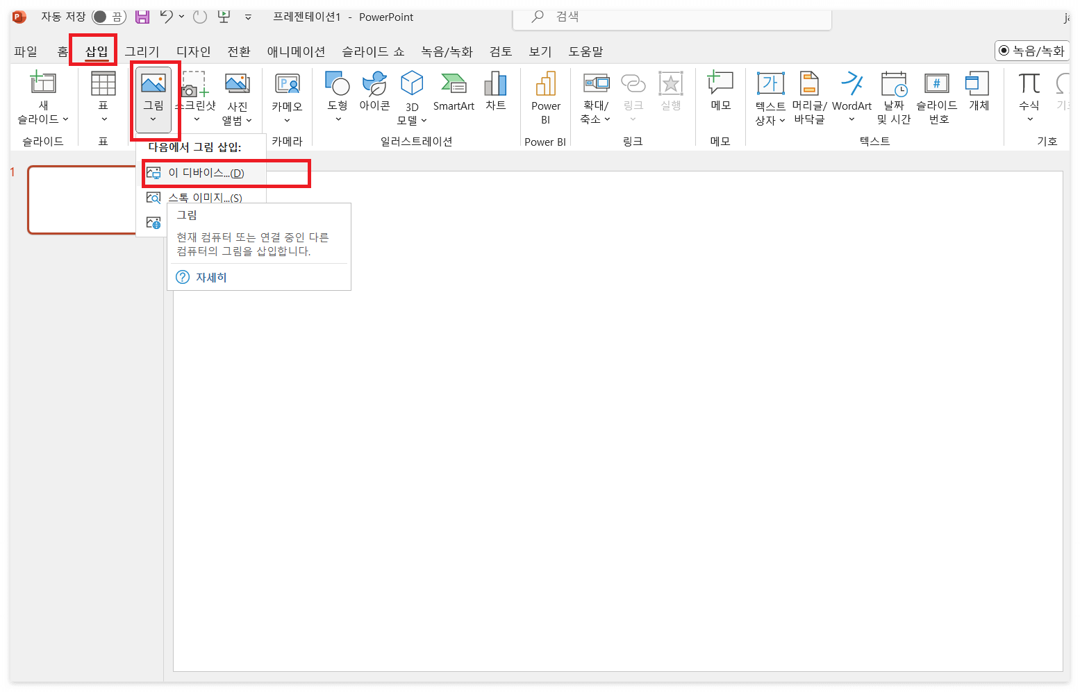 2. 파워포인트에서 "삽입" → "그림"