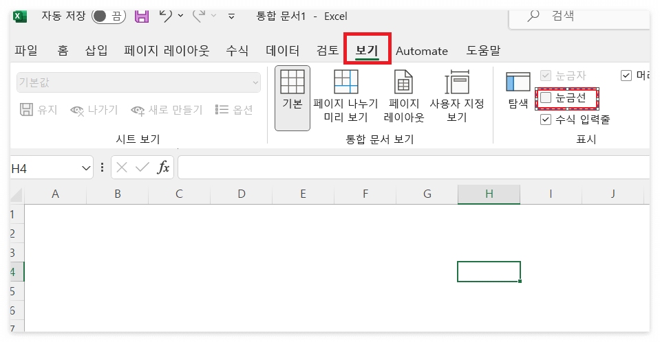 "보기" → "눈금선 체크해제"