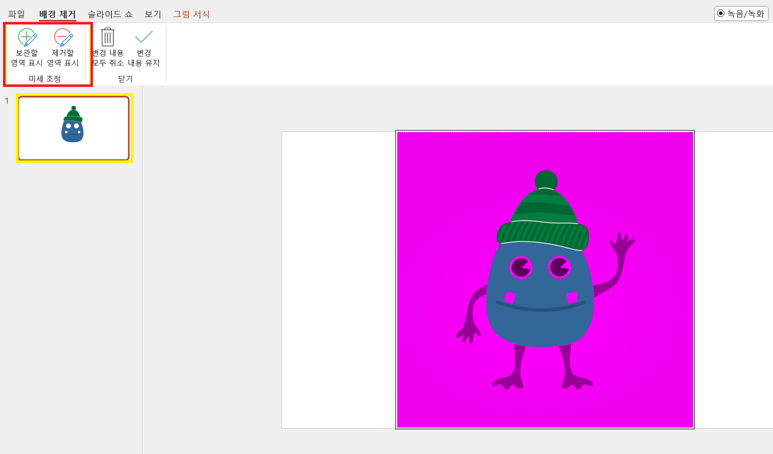 이세 "그림서식"에서 "배경제거"로 이동해서