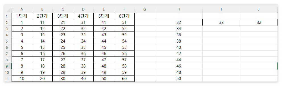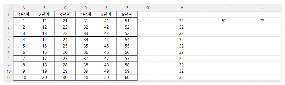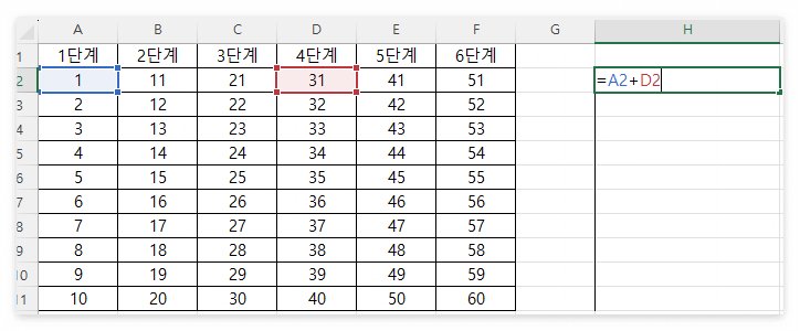 즉, 열과 행을 모두 고정시켰기 때문에 A2의 값과 D2의 값이 드래그 방향과 관계없이 동일하게 1+31이 되어 32 값이 결괏값으로 나오게 됩니다.