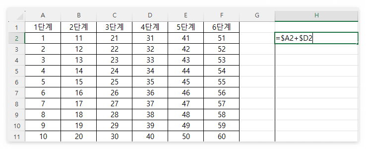 아래 수식(H2셀)을 보면 A2셀과 D2셀을 $ 로 고정해서 더했습니다.