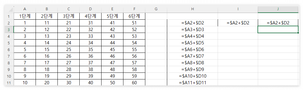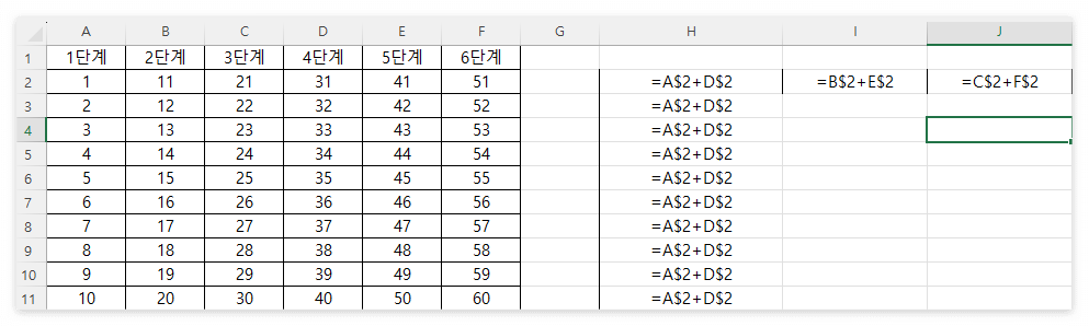 반면, 오른쪽으로 드래그했을 때는 열을 고정시켰기 때문에 (A와 D 옆의 $) 행은 변화가 없어 동일한 값이 계산되었던 것입니다.