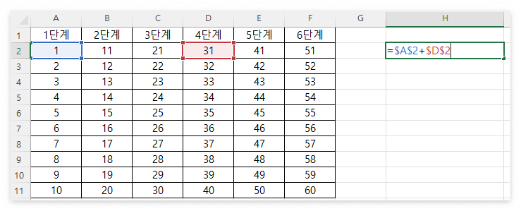 아래로 드래그해서 수식을 적용했을 때는 열은 고정된 상태 (A와 D)이나 행이 변화하는 것을 확인할 수 있습니다. (2,3,4,5,6,7,...)