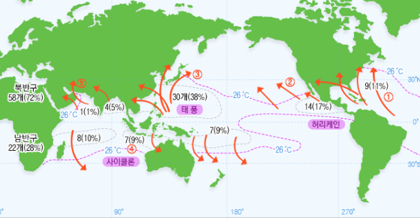 우리나라와 일본에서는 최대풍속이 17㎧이상인 열대저기압 모두를 태풍이라고 부릅니다. 강력한 풍속의 열대저기압을 북서태평양에서는 태풍, 북중미에서는 허리케인, 인도양 남반구에서는 싸이클론으로 부르고 있습니다.