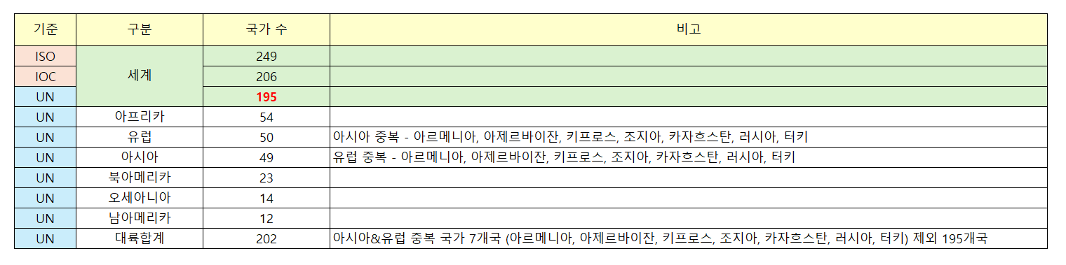 대륙별 국가 수 = 202개국