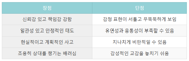 ● 현실적이고 실용적인 사고: 감성보다는 사실과 데이터에 근거한 판단을 선호합니다.