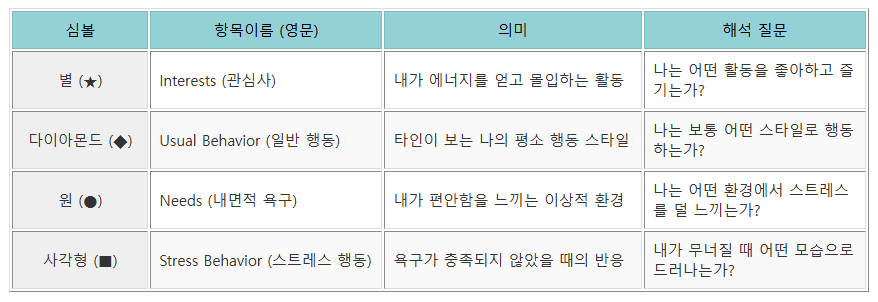※ 이제 버크만 결과지를 보실 때, 각 항목에 어떤 색깔 + 어떤 기호가 있는지를 체크하면서 ‘나의 행동 – 욕구 – 스트레스 – 관심사’ 흐름을 연결해서 보시면 됩니다.